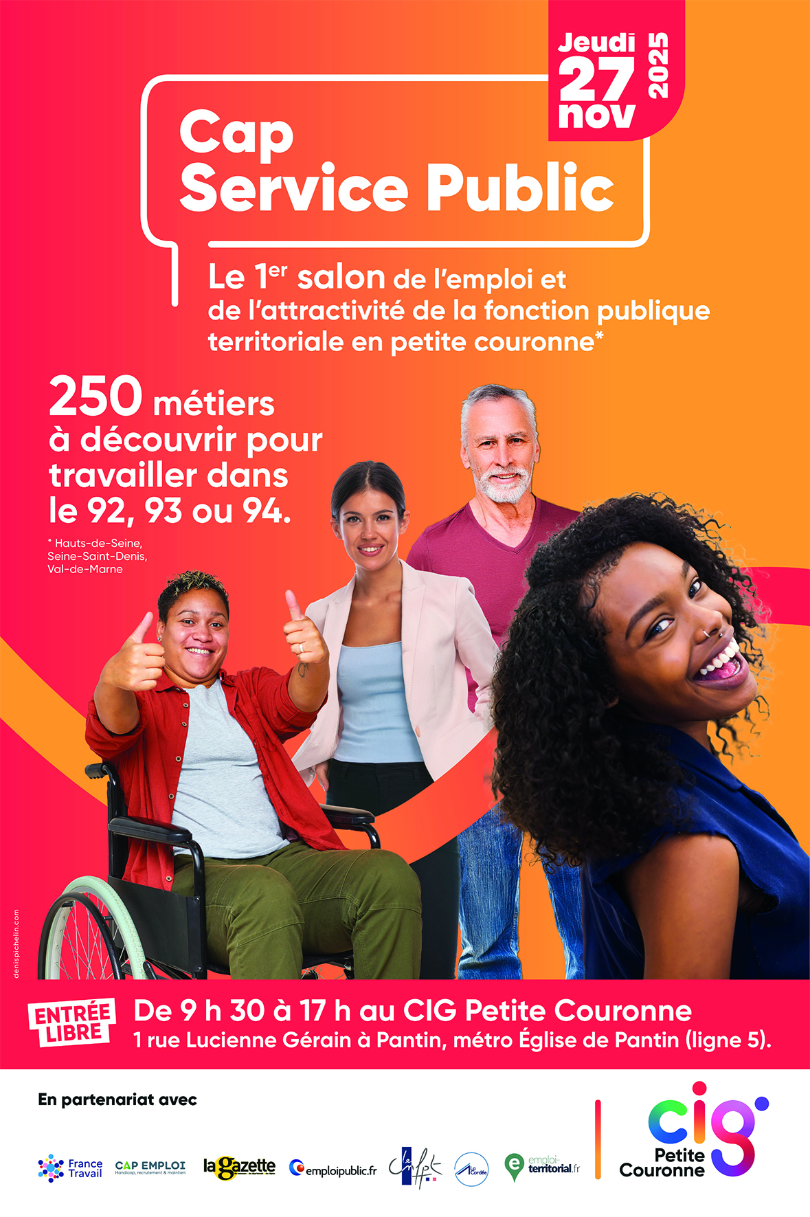 Le 27 novembre 2025 à Pantin, découvrez ces métiers et échangez directement avec des recruteurs lors du 1er salon de l’emploi “Cap Service Public”, organisé par le CIG Petite Couronne.