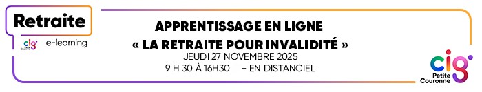 Dans le cadre de son activité d’information et de formation à destination des responsables et des gestionnaires RH, le CIG Petite Couronne vous propose de participer à une session de formation à distance et en autonomie sur la gestion des dossiers de retraite pour invalidité, jeudi 27 novembre 2025 de 9h30 à 16h30.