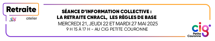 Dans le cadre d’une convention de partenariat avec la CNRACL et de la mission d’information et d’assistance auprès des collectivités et établissements publics affiliés, le service Retraite du CIG Petite Couronne vous propose une séance d’information sur les procédures relatives à la gestion des dossiers de retraite des fonctionnaires.