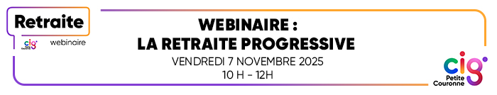Dans le cadre de son activité d’information à destination des responsables et des gestionnaires RH, le service retraite du CIG Petite Couronne vous propose de participer à un webinaire le vendredi 7 novembre 2025 de 10h00 à 12h00, afin de vous présenter la retraite progressive.