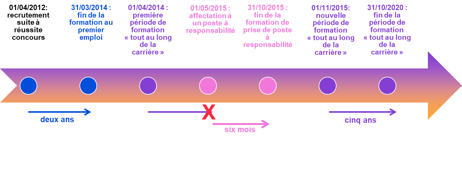 - La période de formation « tout au long de la carrière » et de prise de poste à responsabilité se chevauchant : la période de formation « tout au long de la carrière » en cours (1er avril 2014 au 31 mars 2019) prend fin et une nouvelle période de formation débute du 1er novembre 2015 au 31 octobre 2020.