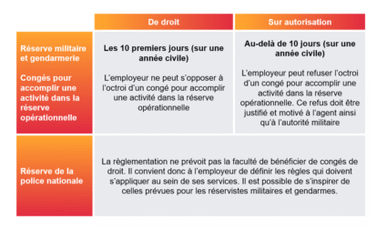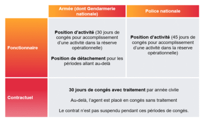 En effet, le nombre de jours de congés pour accomplissement d’une activité dans la réserve opérationnelle varie selon que l’agent est réserviste dans la Police nationale ou dans l’Armée (dont la Gendarmerie nationale) et selon que l’agent est fonctionnaire ou contractuel.
