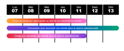 Pour les contractuels : L’article 20 du décret n°88-145 du 15 février 1988 relatif aux agents contractuels de la fonction publique territoriale prévoit également que l’agent contractuel qui accomplit une période d’activité dans la réserve opérationnelle sur son temps de travail est mis en congé avec traitement. En pratique : Le départ en mission dans le cadre d’une réserve opérationnelle n’est donc pas couvert par une autorisation spéciale d’absence (ASA), mais bien par un congé spécifique. Par ailleurs, ce congé ne vient pas réduire pour autant les droits à congés annuels de l’agent (voir question n°13). Ce droit à congés spécifique ne s’exerce que lorsque l’agent est convoqué sur une période qui correspond à son temps de travail. Exemple : Si l’agent travaille 35 h du lundi au vendredi et qu’il est convoqué pour une mission de 7 jours du lundi au dimanche, alors ce dernier bénéficie de 5 jours de congés pour accomplissement d’une activité dans la réserve, du lundi au vendredi.