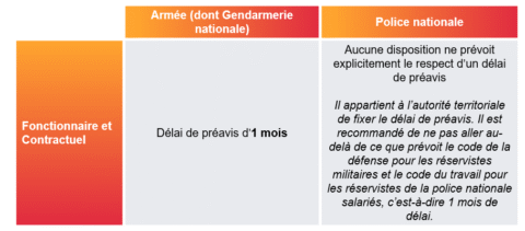 Pour cela, il convient néanmoins de respecter un certain formalisme, et notamment un délai de préavis. Ce délai varie selon que l’agent est réserviste dans l’Armée (dont la Gendarmerie nationale) ou dans la Police nationale.