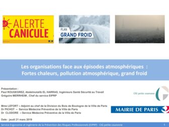 L’objectif principal de cette rencontre était de présenter les enjeux liés à cette thématique, les aspects réglementaires, l’importance d’anticiper ces épisodes atmosphériques et la mise en œuvre de mesures de prévention. La présentation a débuté par un rappel des dispositifs règlementaires sur les aspects fortes chaleurs et grand froid. Suite à cette introduction, une démarche de prévention mise en place au sein de la Division du Bois de Boulogne de la Ville de Paris a été présentée. Enfin, les médecins de prévention de la Ville de Paris ont abordé la problématique de la pollution au travail.